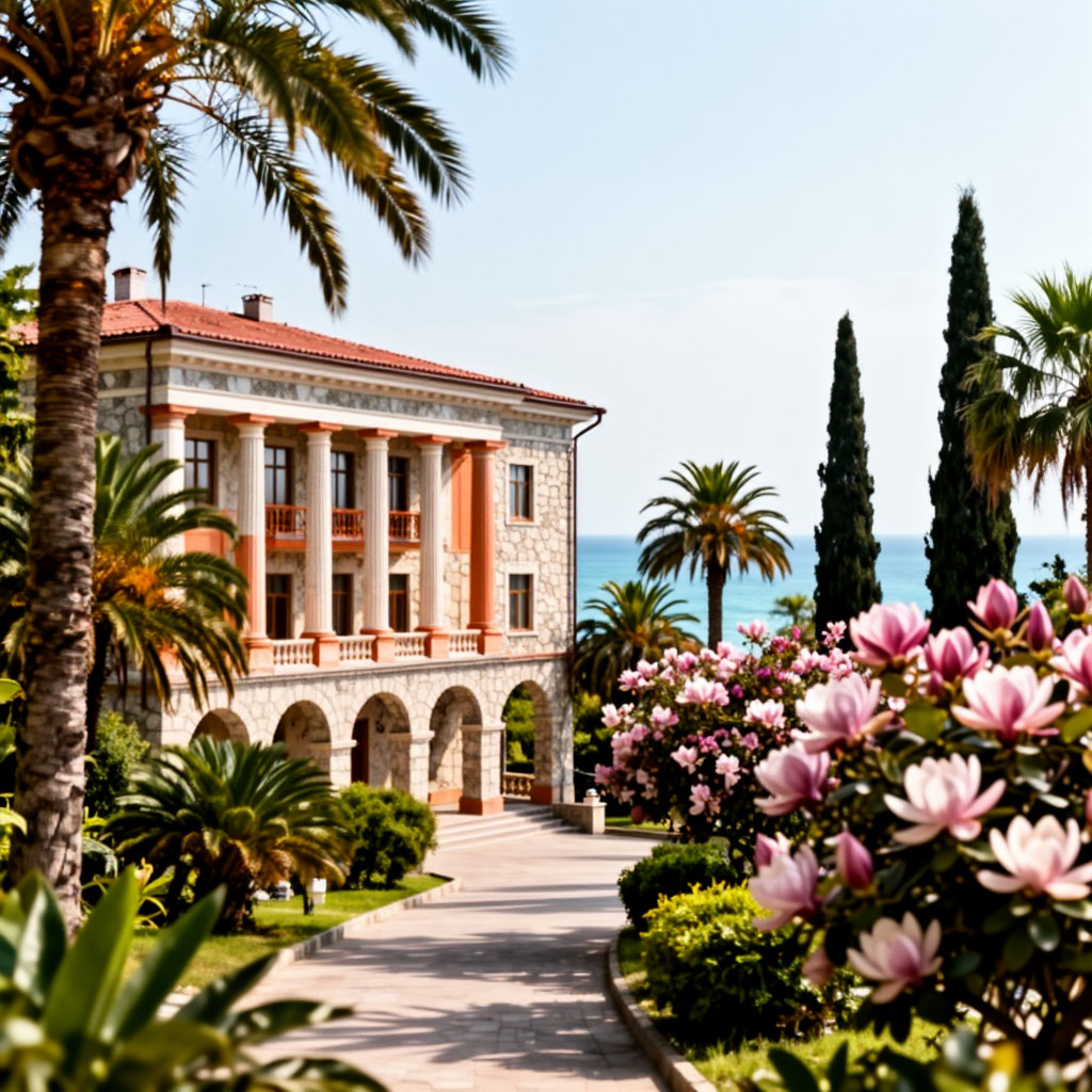 Территория пансионата “Багрипш” в Гагре с кипарисами, олеандрами и пальмами – прекрасное место для пеших прогулок. Здесь есть парковка и аптека, подогреваемый пресноводный бассейн под открытым небом и игровая площадка для детей.